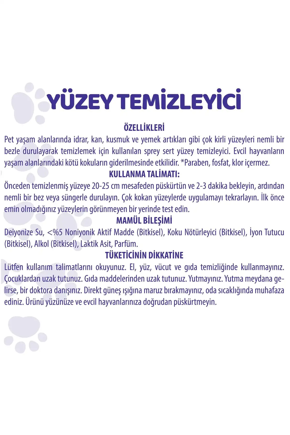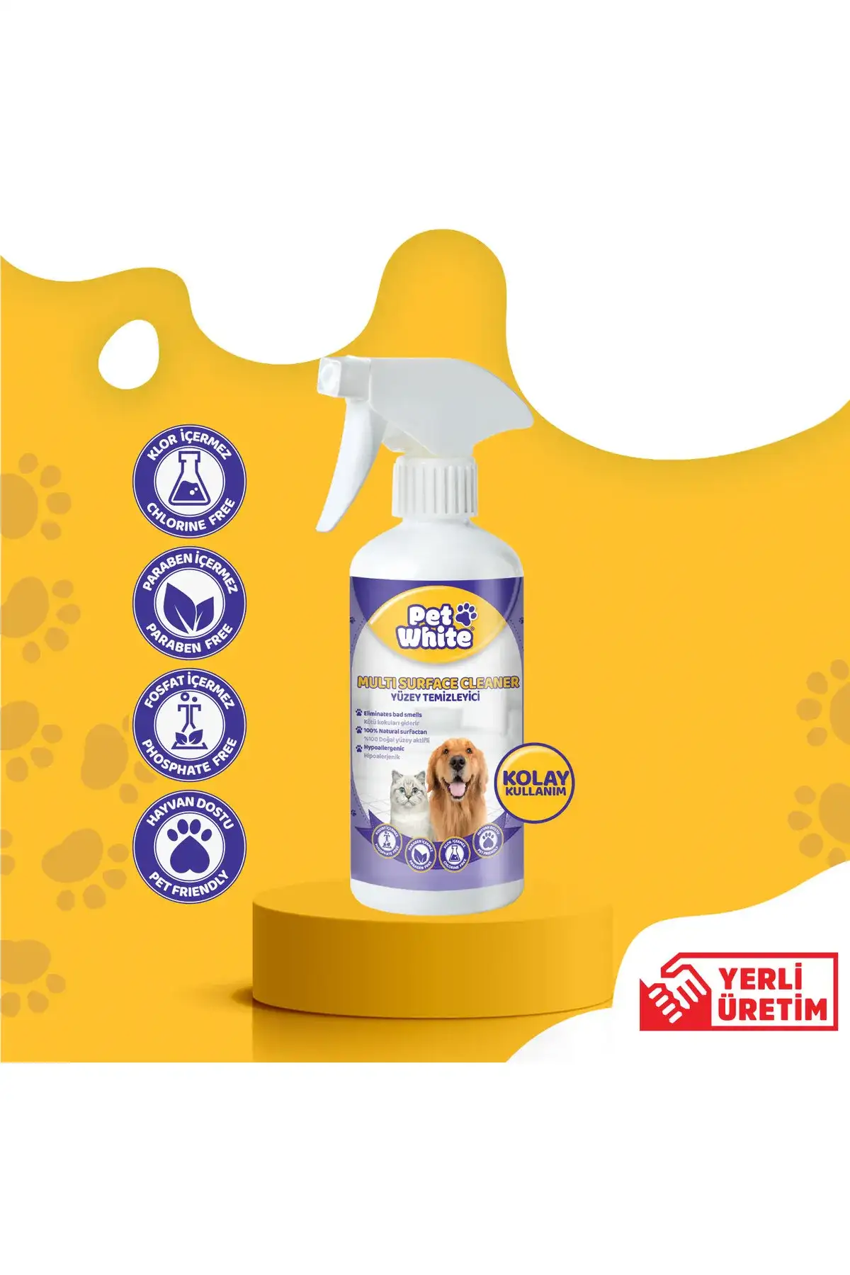 Pet White Evcil Hayvan Yüzey Temizleyici Sprey 500 ml Pet yaşam alanlarında idrar, kan, kusmuk ve yemek artıkları gibi çok kirli yüzeyleri temizlemek için özel olarak üretilmiştir. Evcil hayvanların yaşam alanlarındaki kötü kokuların giderilmesinde etkilidir. ; Paraben, fosfat, klor içermez. ; Kedi, köpek, kuş vb. evcil hayvanların tüm yaşam alanlarında kullanabilirsiniz. ; Kullanım Şekli:Kirli yüzeye 20-25 cm mesafeden püskürtün ve 2-3 dakika bekleyin, ardından nemli bir bez veya süngerle durulayın. Çok kirli yüzeylerde uygulamayı tekrarlayın. İlk önce emin olmadığınız yüzeylerin görünmeyen bir yerinde test edin. ;