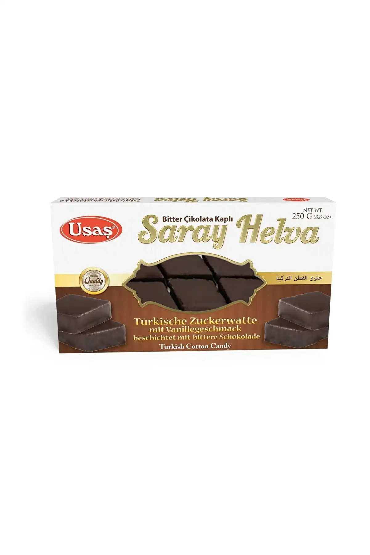 Usaş Çikolata Kaplı Saray Helva 250gr İçindekiler : Şeker Buğday Unu Bitkisel Yağ (Palm) Vanilya Aroması Konfiseri Çikolata %20 Süt ürünü ve buğday proteini içerir Fındık Fıstık ve Yer Fıstığı içerebilir